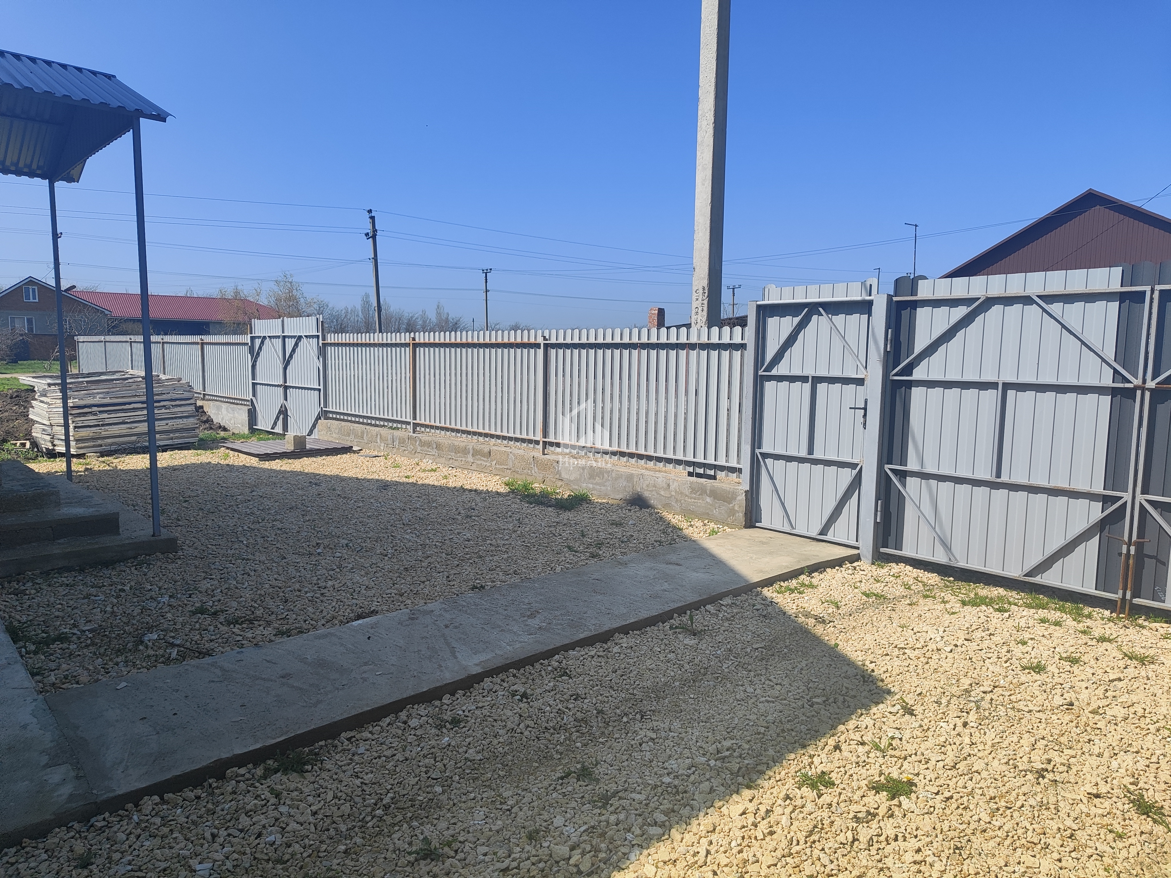 Дом огорожен по периметру забором, двор отсыпан щебнем, оборудован навес..